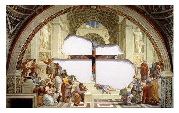 I sought to follow the same footsteps, my utilizing a medium that he had previously explored with one of his popular techniques of creating art with acid. Since Gustav brushed the acid onto numerous sheets of nylon during his performances, I wanted to create an interface that shows the conclusion of what would happen if the medium was a painting -- but not just any painting, a painting that gather not only people but also thought and a time period of the Renaissance together. With the application of Metzger's auto-destructive art message onto this painting, I sough to highlight the gaps in which certain elements and change brought upon by the ideas of Renaissance ultimately also contributed to the destructive elements of the society- those mentioned by Metzger. From the advancement of scientific theory during the Renaissance paving the path to more modernization and the Industrial Revolution, Metzger's ideas of destructive elements in today's society such as capitalism, environmental issues caused by technological advancements and the greed of a consumer society, and invention of new powerful nuclear weapons can be tied back to this time period. Therefore, I wished to apply and pay homage to Metzger's unique style and deep underlying message of his art.