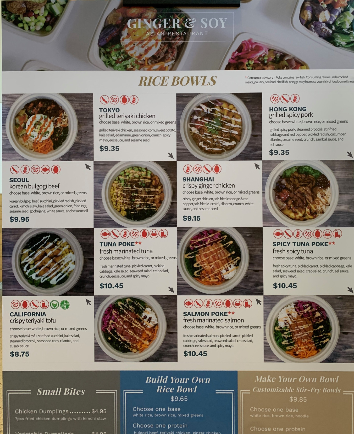 One of my design reflections that I greatly disliked and yet still come across daily during lunch is Ginger & Soy's Rice Bowls poster (included a pic below for quick reference). I recall looking at this poster for a longer time that usual and noticing the mouse arrows pointing in all sorts of directions in a grid with many descriptions and pictures of rice bowls. Yet.. it made my decision of choosing something new to try very difficult (and I recall it being quite exhausting for my eyes to try to match the arrows to the picture.